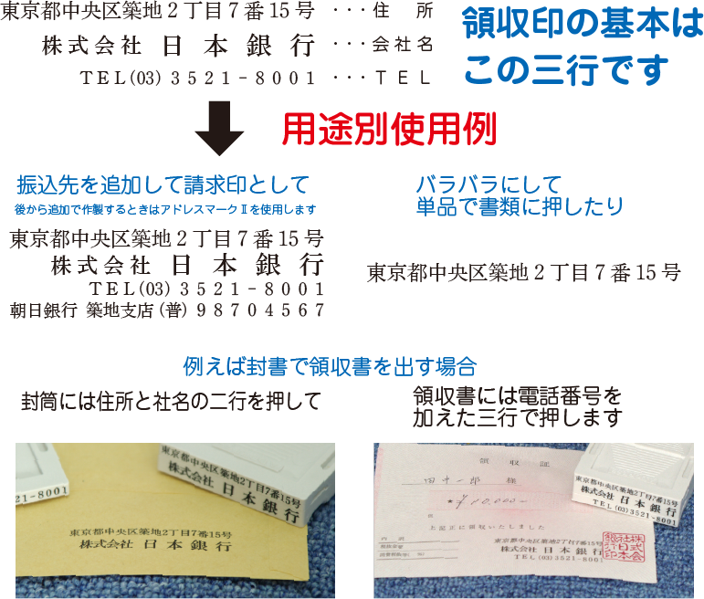 当店ではパソコンで作った領収書の一部にゴム印や角印を押すことで偽造を防止することや機械の故障時に既製の領収書用紙へゴム印と角印を押すことで対応することをお勧めいたします。