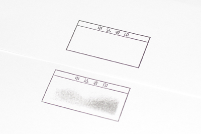上が当店のゴム印、下が簡素に作成できる1工程で作成したゴム印の印影です。下のゴム印はゴムが薄く彫りも浅いため強く押すと文字の無い部分が汚れてしまいます。